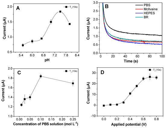 The pH can affect the enzymatic activity in an aqueous solution [23]. Therefore, the influence of pH on the sensor response was investigated using a 0.1 mol L−1 phosphate buffer solution at pH from 5.8 to 9.0. The results (Figure 4A) showed that the highest peak current occurred at pH 7.5, which was close to the optimum pH for the activity of the non-immobilized AChE enzyme (pH 7.0) [24].