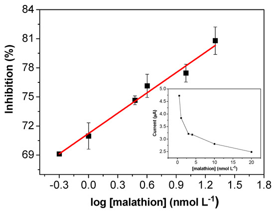 After optimization of the experimental parameters, malathion was used as an analyte to evaluate the response of the modified electrode. The sensitivity of the sensor was investigated by chronoamperometry, with determination of the current signal in the presence of the pesticide at different concentrations. The analytical curve for the determination of malathion (Figure 6) presented a linear range from 0.5 to 20 nmol L−1 and could be described by the following equation: I (%) = [71.2 (±0.2) + 7.0 (±0.4)]/log [malathion] (nmol L−1), with R = 0.9942 (n = 6). The calculated limits of detection and quantification were 0.3 and 0.8 nmol L−1, respectively. The relation between the current and the concentration is shown in the inset of Figure 6. As can be seen, the current gradually decreased as the malathion concentration increased, due to the inhibitory effect of the pesticide on the enzymatic activity.