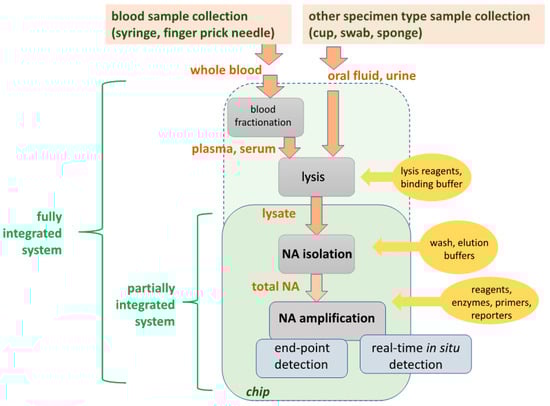 Molecular diagnostics tests typically comprise sequential steps (‘unit operations’) to: (1) Lyse cells or virus; (2) extract, purify and concentrate total DNA or RNA from the lysate, and (3) amplify specific nucleic acid target sequences to facilitate their detection by optical or electrochemical means, either as a positive/negative endpoint test or a real-time monitoring of amplification product generation for quantifying the target template in the sample. Figure 1 shows a process flow for molecular diagnostics. For blood tests, plasma or serum is separated from whole blood before lysis. For oral fluid (‘saliva’), urine, or other sample types, raw sample is directly subjected to lysis. Partial integration, combining NA isolation (extraction, purification, and concentration of total NA), enzymatic NA amplification, and amplicon detection on a single chip, is well established, as described in the review. Full integration, including plasma isolation and lysis, are also feasible, but optimum design approaches are application dependent, i.e., specific to type of pathogen (virus, Gram+ or Gram− bacteria, parasite), sample type (blood, urine, oral fluid), sample volume (5 to 1000 μL). Table 2 shows various design options for implementing each unit operation. POC microfluidic applications predominantly employ a combination of chemical lysis, solid-phase nucleic acid isolation, isothermal amplification, and optical detection. The process of Figure 1 is implemented in the laboratory with spin column kits based on porous silica as a nucleic acid capture phase and chaotropic salt solutions as a binding agent [,], and requires a centrifuge and a benchtop thermal cycler for PCR. Such solid-phase extraction can also be readily implemented in a microfluidic format. Alternatively, after lysis, specific nucleic acids can be captured by hybridization [,], followed by release and detection or optionally amplification/detection []. In another option, bacteria or viruses can be immunocaptured or fractionated by physical means, followed by lysis, nucleic acid isolation, and amplification/detection [,]. The extraction and NA isolation step removes substances that inhibit amplification []. Microfluidic implementations of solid-phase extraction can use various binding phase materials (silica, alumina, polymers, porous membranes, microstructures, packed beds, and beads) [,]. Chips for NA isolation using silica-based binding phases [,,,,,] nanoporous alumina [], polymeric monoliths [], and chitosan [,] have been described, often integrated with amplification and detection. In addition to solid-phase extraction, other methods based on immiscible phases [,], surface functionalization and surface charging are feasible []. Microfluidic nucleic acid solid-phase extraction with silica binding phases can be enhanced by adding carrier RNA to the lysate []. For whole blood samples, plasma containing virus and bacteria is first separated from the sample using a centrifuge or other means, thus removing red blood ‘cells’ that would otherwise tend to clog the device as well as hemoglobin and other substances which inhibit or interfere with downstream processing. In summary, NAATs offer high sensitivity and specificity, but require considerable sample processing (compared to immunoassays, and cytology. The diagnostics test can be usefully viewed as a sequence of unit operations, and simplified operation is achieved by their seamless integration on a single microfluidic cartridge (‘chip’).