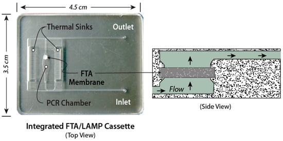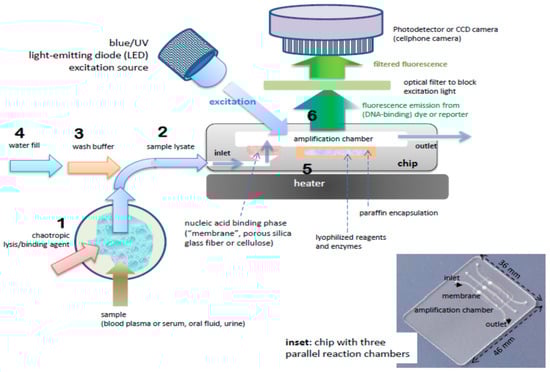 The benchtop molecular diagnostics protocol can be adapted to a microfluidic format [,]. Figure 2 shows a slightly schematized example of a chip-based system, featuring an amplification reaction chamber (~25 μL) and a flow-through nucleic acid capture membrane at the inlet of the amplification chamber. The clear plastic chip (Figure 3) is placed on a temperature-controlled stage which includes a light source (light-emitting diode, LED or smartphone flashlight), an optical filter, and detector/camera (possibly smartphone camera) for optical measurements.