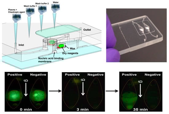 - Rodriguez, N.M.; Wong, W.S.; Liu, L.; Dewar, R.; Klapperich, C.M. A fully integrated paperfluidic molecular diagnostics chip for the extraction, amplification, and detection of nucleic acids from clinical samples. Lab Chip 2016, 16, 753–763. [Google Scholar] [CrossRef] [PubMed]