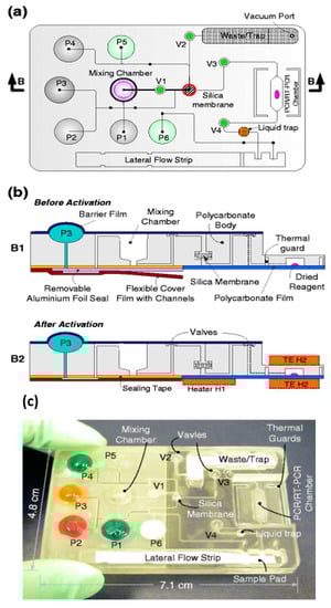 Pouch-based chip integrating sample lysis, solid-phase nucleic acid extraction with a porous silica membrane nucleic acid binding phase, RT-PCR/PCR (reverse transcription polymerase chain reaction) amplification chamber, and lateral flow strip detection of amplicons. Buffer solutions are contained in deformable pouches fabricated into the chip, where depressing the pouch (snap-through) squeezes liquid into channel. Diaphragm valves provide flow control. (a) Top plan view and (b) cross sections; (c) photo of chip. From [].