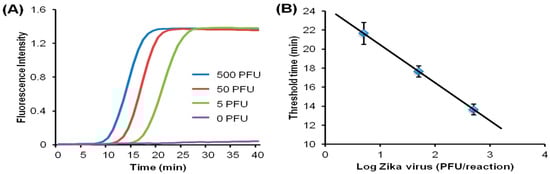 Chip-based LAMP POC diagnostics. Detection with fluorescent intercalating dye: excitation with Smartphone flashlight LED, emission intensity monitored with a Smartphone CCD camera. (A) Real-time fluorescence intensity curves as a function of amplification incubation time for four concentrations of Zika virus (0, 5, 50 and 500 PFU, plaque forming units). By establishing a threshold fluorescence level (e.g., time needed for the signal to reach half its saturation value), a threshold time for each concentration can be determined; (B) threshold time correlates inversely with the log of Zika concentration (PFU, plaque forming units), providing a calibration curve to estimate Zika concentration in sample. From [].