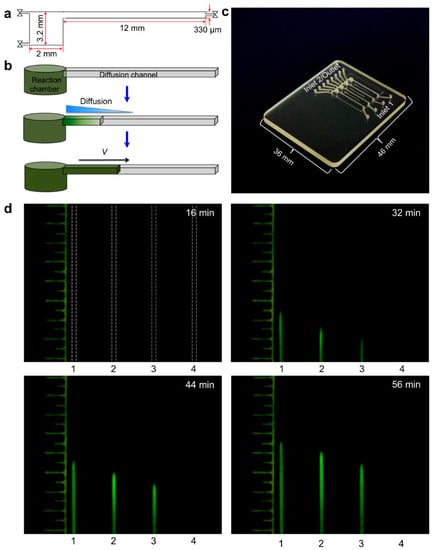 Most POC molecular diagnostics systems use an optical (fluorescence, absorption, luminescence) or visual (color change, turbidity) means of detecting the amplification product. Using a DNA-intercalating dye, such as SYBR™ Green, SYTO™ Green, or Eva Green™, the reaction progress can be monitored by measuring the fluorescence emission intensity [], excited with ultraviolet or blue light from an LED (Figure 6). Qualitative or semi-quantitative colorometric detection (visible color change of reaction) of amplified dsDNA can be done with dyes such as leuco crystal violet (LCV) [,], as shown in Figure 7, pH indicator, or hydroxynaphtol blue [] added to the reaction. An alternative optical method uses turbidity caused by precipitation products which provides a visual indicator or can quantified by optical absorption measurements []. Electrochemical detection methods are also feasible due to the release of protons during polymerase [,,,,]. Still another approach features lateral flow strips for the detection of amplicons labeled with conjugated primers, e.g., biotin, that are captured on test line striped with antibodies against the label [,,,]. Lateral flow strips as such can provide a qualitative (positive/negative) test result. A novel molecular test format (‘nuclemeter’) comprising a reaction-diffusion column provides end-point quantitative detection based on the length of the reacted portion of the column—analogous to temperature measurement from the length of a mercury column in an old style glass capillary thermometer []. As shown in Figure 8, template injected into a chamber diffuses along with amplicon through a conduit filled with polymer matrix or made in paper. The conduit is pre-loaded with polymerase, reporter, and primers. As the reaction progresses, a zone of green fluorescence (when fluorescent dye is used) grows, the length of which is proportional to the amount of initial (sample) template and reaction time. A calibration ruler alongside of the channel provides a visual indication of reaction ‘length’ and thus a measure of sample target. In summary, optical methods prove versatile and readily adaptable to POC microfluidics: fluorescence (sensitive, can be quantitative; requires light source, optical filters, and detector/camera), luminescence (sensitive, quantitative, requires detector/camera), nuclemeter (sensitive, simplified quantification, requires light source, filters, and camera) and color change (qualitative, can be read by eye).