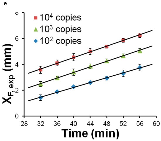 Nuclemeter for Quantifying Nucleic Acids: Nuclemeter chip features an array of reaction-diffusion microconduits for isothermal amplification. The chamber and conduits are filled with LAMP amplification mix including an intercalating DNA green dye, primers, and hydroxypropyl-methyl-cellulose as a low-viscosity sieving matrix to reduce diffusivity. The target nucleic acid template is introduced at the column’s inlet. As isothermal amplification proceeds, the amplification products diffuse down the channel, such that the distance of the reaction front from the chamber XF can be correlated with time and template number (copies). At any given time, the length of the fluorescent column can be calibrated against a ruler scale imprinted on the chip. (a) Cross-section of reaction-diffusion channel; (b) schematic of reaction front, (c) photo of nuclemeter chip; (d) Photos of reaction diffusion conduits at 0, 16, 32 and 56 min, and (e) Diffusion front XF position (mm) as a function of time for three different sample (initial) template concentrations: 104, 105 and 106 copies. From [].
