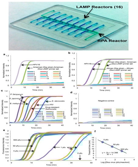 Multiplex two-stage isothermal amplification/detection. Sample is introduced into the center manifold chamber containing primers for up to sixteen different DNA or RNA targets, and amplified with RPA. Top: Chip showing center reactor and 16 branching specific LAMP reactors. Bottom: Graphs showing real-time fluorescence intensity from sixteen LAMP reaction chambers: (a–c) Various targets, distributed LAMP chambers; (d) negative controls; (e) serial dilutions of Zika virus, and (f) threshold time vs. Zika template concentration. From [].