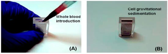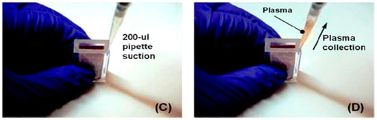 Operation of plasma extraction module. (A) Introduction of a 1.8-mL whole blood sample, (B) wait 10-min for cell sedimentation, (C,D), extract 200 μL of plasma. From [].