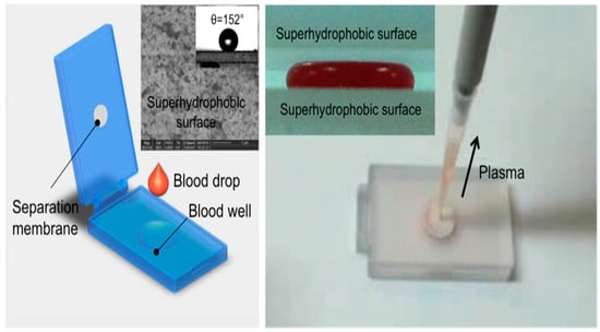 ‘Clam-shell’ plasma separator with top mounted filtration membrane for POC applications. Left: A drop of blood placed is deposited in well, and lid is closed. The top and bottom inner surfaces have been rendered superhydrophobic by applied coatings to contain the blood drop and discourage analyte adsorption to surfaces. Inset: Wetting angle of blood on superhydrophobic surface; Right: After ten minutes, allowing for sedimentation of hemocytes, plasma can be aspirated through separation membrane using a pipette. Inset: Compressed blood sample between two hydrophobic surfaces. From [].