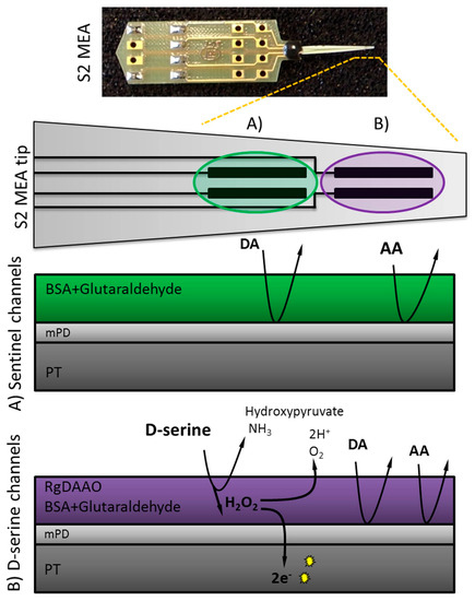 Scheme for D-serine detection using S2 style Microelectrode Array (MEAs) consisting of two pairs of platinum (PT) sites. When D-serine comes into contact with Rhodotorula gracilis (RgDAAO) (platinum sites B: D-serine recording channels) H2O2 is produced by the enzymatic reaction, crosses the mPD barrier and is then further oxidized, yielding two electrons per molecule. At the amperometric fixed potential of +0.7 V, the sentinel channels (platinum sites A) detect only electrochemically active interferents and background noise, whereas the RgDAAO coated channels measure in addition D-serine.