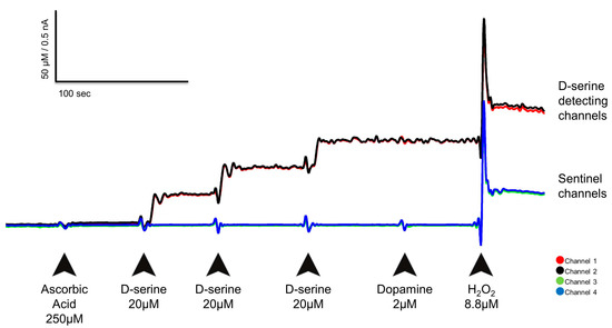 D-amino acids aside from D-serine can also be a substrate of D-amino acid oxidase. D-aspartate, which is the second most abundant D-amino acid, is not detected by D-serine biosensors because it is not a substrate of DAAO, but D-alanine, the third most abundant D-isomer found in the mammalian brain, can be detected (e.g., RgDAAO MEAs had a sensitivity of 18.56 ± 1.6 pA/µM to D-alanine; n = 12). Yet, the endogenous concentration of D-alanine in the brain is only 3% of the D-serine concentration and can be thus considered negligible for in vivo measurements [28,64].
