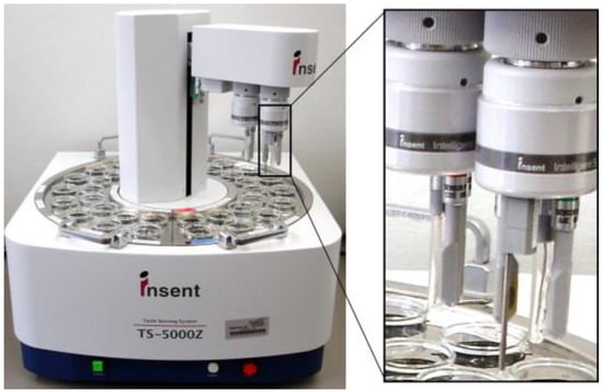 Given the numerous advantages and a wide range of applications of electronic tongue systems, their commercialization was only a matter of time. The first electronic tongue that became available on the market was constructed by Toko and co-workers [6]. SA402B and TS-5000Z (Figure 2) Taste Sensing Systems (Intelligent Sensor Technology Inc., Atsugi-shi, Kanagawa, Japan) are based on Toko’s idea and consist of 7 potentiometric electrodes with lipid-polymeric membranes [33]. The latter is the newest model, designed for both use in a laboratory and as a part of a network system in quality control. It enables detection of five basic tastes and also flavour attributes like “sharpness” and “richness” [34]. Both systems are mainly used to determine and quantify the intensity of each taste in food products [35,36,37] and pharmaceuticals [38,39,40,41]. A review concerning the application of commercial systems for evaluation of taste masking properties was recently published [42].