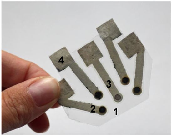 Paper-based electronic tongue system applied for discrimination of beer and wine samples 1. lamination sheet serving as support, 2. ion-selective electrode, 3. reference electrode, 4. electrical connections (reprinted with permission from [17] ©Elsevier).