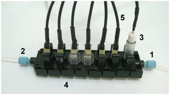 Example of an electronic tongue system with individual sensing modules applied for the analysis of fermentation: 1. inlet, 2. outlet, 3. reference electrode, 4. single modules with individual sensors, 6. electrical connections (reprinted with permission from [109] ©Elsevier).