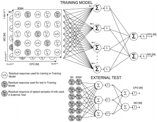 Subsequent development was the further reduction of enzymes required for the discrimination of chlorpyriphos-oxon and malaoxon to only two genetically engineered variants: B4 and B394, a mutant with a higher sensitivity, both from Drosophila melanogaster. The biosensors were inserted in a flow cell and used in a flow system in order to have a short analysis time and good reproducibility. A set of 19 solutions with various concentrations of both insecticides was used for the development of the ANN, and the modelling was validated with another six solutions of mixtures of insecticides with known concentrations. The ANN was built using a combination of 9 training algorithms and 14 different structures with a different number of neurons, hidden layers, and different transfer functions (logsig–logsig, logsig–purelin, tansig–tansig–purelin). The final selected parameters included an input layer with 2 neurons, a hidden layer with 10 neurons, and an output layer with 2 neurons (Figure 3). The range and concentrations for each insecticide in the mixture were chosen from the inhibition curves obtained with standard solutions that contain a single insecticide and were 1.09 × 10−10 to 5.0 × 10−12 M for chlorpyriphos-oxon and 1.01 × 10−9 to 9.17 × 10−11 M for malaoxon in milk samples [37].
