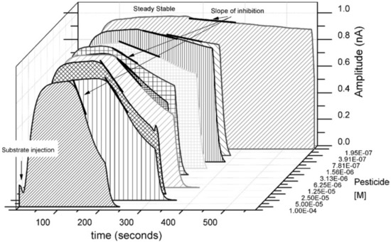 Mazzei et al. [90] proposed an inhibition–amperometric biosensor that is based on the reactions pictured in Figure 8.