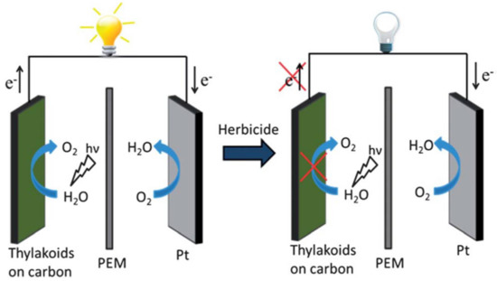 Illustrative examples of the progress of photosynthesis-based biosensors towards real-life applications include a self-powered biosensor and a multi-biosensor herbicide analyzer. The self-powered biosensor for detection of herbicides in water was designed as a solar cell, with thylakoid membranes at bioanode and with a Pt cathode. Photosynthesis-inhibiting herbicides decreased the current output of the biosolar cell (Figure 6). The limits of detection for commercial herbicides atrazine, bromacil, and diuron were below 0.5 μg L−1, (below the EPA limits) and the linear response spanned up to ~15 μg L−1 [65].