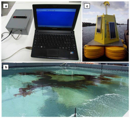 (a) Six-cells portable fluorimeter developed by Biosensor Srl (Italy) for analysis of microalgae fluorescence responses in the presence of seawater pollutants. (b) Seawater oil spill simulation in an outdoor mesocosm tank at the Institute for Coastal Marine Environment (Messina, Italy); the perimeter tubing system to simulate the pelagic environment and prevent hydrocarbon adhesion is observable. (c) Automated telemetry-operated marine buoy (IDS Monitoring Ltd., Clare, Ireland) where the microalgae bioassay and fluorescence instrumentation for pesticide screening were installed. Reprinted from [75] with permission from Elsevier.