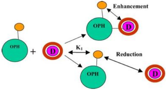 Schematic of Decoy-Enzyme interaction for enhancement in the absence of substrate. Decoy (D) binds to enzyme–nanogold conjugate (OPH), leading to a surface enhanced fluorescence of the decoy. Reproduced from [94] with permission from Elsevier.