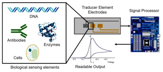 In both cases, the main idea is to have an electrochemical reaction from a detectable analyte and a sensor material that is transduced as voltage, current, and impedance which finally is processed and recorded by an electronic system [31]. The main topic of this section is about transducers as a detection mechanism for environmental application (Figure 4).