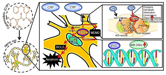 Pesticides, e.g., cypermethrin (CYP), are being extensively employed in almost all sectors including agricultural, livestock, and households, etc. The toxicities induced by pesticides are assessed through different assays and models including in vitro, in vivo, or in situ strategies [21]. These have been detected in high concentrations in surface and groundwater [21]. The neurotoxicity and other significant consequences of CYP are presented in Figure 3. Pesticides are used worldwide to kill, incapacitate, or prevent pest damage to plants [16]. The concern for pesticides as ECs is due to their environmental persistence (half-lives) over time. Studies have proven that these can remain for a long time in solids and sediments. Also, these can be accumulated in non-human organisms with acute toxic effects, such as the mass killing of biota (e.g., bees, amphibians, and fish) [22,23]. Compounds, such as DDT, HCH, toxaphene, Aldrin, and dieldrin, are still present in soils and watersheds, even after being banned in 2002 at the Stockholm convention. There are not enough mechanisms to detect these chemical groups in water, and their potential for toxic effects on aquatic fauna remains unexplored [24,25,26].