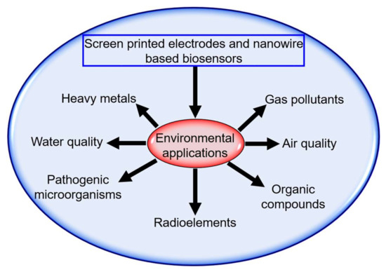 Across the globe, the controlled or uncontrolled release of environmental contaminants, e.g., toxic heavy elements, antibiotics, and pesticides to the environment is a serious concern [1]. Therefore, there is an urgent need to design new prototypes to detect their presence in terrestrial and aquatic ecosystems. Low sample concentration and the lack of selectivity and sensitivity of traditional methods are among the significant bottlenecks of conventional methods. Moreover, conventional methods (e.g., chromatography) require long and specialized sample pre-treatment, which may potentially translate to time-consuming processes. In this context, electrochemical biosensors have proven to be useful tools to detect small sample volumes, low concentrations of biological components, and sometimes miniaturized analytical devices [2,3]. Recent advances in the fabrication and application of electrochemical biosensors for biomedical, agri-food, and environmental analyses have been reviewed [4]. Electrochemical-based techniques for sensing pollutants can be categorized as potentiometric, amperometric or coulometric, voltammetric (incorporating preconcentration and stripping steps), and conductometric.