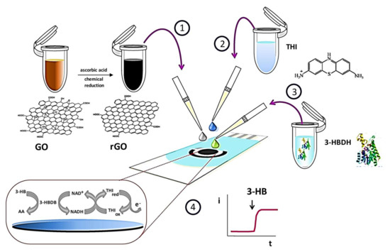 SPEs are conductive ink printed circuits on a substrate. The technique uses a mold, stencil, or mesh to cast ink into a substrate by a physical barrier, and then the printed ink is cured and fixed with an insulator layer. The substrate materials include plastics, ceramics, paper, and most recently skin [36]. The conductive ink is desirable to be a good conductor but sometimes a material is required that interacts with the targeted analyte and previous works have used silver and carbon ink. Also, gold, platinum, noble metals, and other costly materials have been considered and tested. As said previously, SPE sensors relay on the redox reaction and its electrochemical consequences. The current properties to improve the sensing mechanism are based on; chemical modifications to increase catalysis, increase electrode surface by adding new morphologies, and stain electrodes with biomolecules to increase selectivity [30,36]. Martínez-García et al. [37] reported an electrochemical enzyme biosensor for 3-hydroxybutyrate detection using SPEs modified by reduced graphene oxide and thionine. Scheme of the steps involved in the preparation and functioning of the 3-hydroxybutyrate dehydrogenase (3-HBDH)/thionine (THI)/reduced graphene oxide (rGO)/screen-printed carbon electrode (SPCE) biosensor is illustrated in Figure 5. Amperometric responses were obtained according to the sequence of reactions shown in Figure 5 [37].