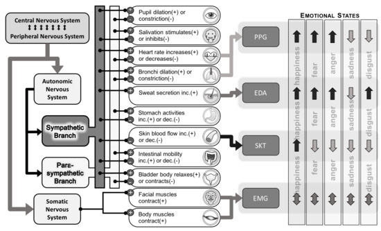 Emotions can be recognised by mapping specific patterns of the measured biosignals based on physiological responses promoted by an emotional perception [27,28]. Many researchers have produced empirical evidence showing that the human brain orchestrates the autonomic nervous system (ANS) and endocrine systems, which then innervate the visceral organs to produce autonomic specificity [29,30,31]. A comprehensive study of an affective wearable illustrated by Picad [32] set off the application in wearable physiological measurements on emotion recognition, which is a sub-branch of affective computing [21]. During the past two decades, research on emotion wearables has emerged aiming to enable ambulatory emotion recognition by incorporating the advancement in sensing technologies [33,34], networking technologies [35,36] and emotion recognition methodologies [37,38]. Research on emotion recognition for wearables has focused mainly on using common biomedical sensors, and the collection of biosignals as a training dataset is fed to a classifier based on modern machine learning algorithms. Recognition accuracy varies according to the choice of sensor signals and their derivatives, the placement of sensors, the presentation and types of stimuli, as well as the different classification algorithms [39,40,41]. Recent research indicates an upward trend in the number of features extracted from those physiological signals promoted by emotion perception for boosting the prediction accuracy based on supervised learning algorithms, and that number can even exceed 100 in certain research methodologies [42,43,44]. Principle component analysis (PCA) may help reduce the number of effective variables, but the stable control of a high number of features is still a significant challenge particularly in wearable devices [45,46]. However, original research on autonomic specificity [27,28,29,47,48,49,50] did illustrate a simple relationship between some basic discrete emotional states and the associated physiological responses such as the variations in heart rate, the magnitude of changes in skin conductance, the subtle fluctuations in fingertip temperature and also the relatively complicated contractions on facial and skeletal muscles. Figure 1 depicts a simplified relationship between the nervous systems, some of the affected visceral organs, common wearable biosensors for emotional state recognition and the ANS specificity that were demonstrated for some discrete emotions from previous empirical studies [29]. The figure only shows those autonomic patterns about which most researchers agree, and the emotion recognition process of the current study also relies on this pattern. Motor programs activating the skeletal muscles of the face and certain parts of the body are also believed to be concomitant to the ANS during emotional responses and are normally treated as one of the contributors to the physiological specificity for emotions [51,52,53].