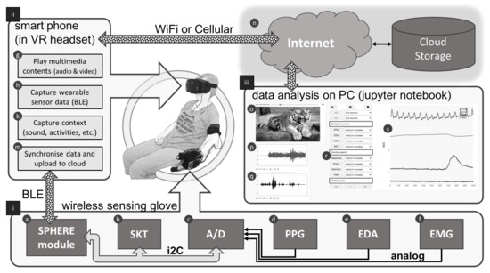 - Wearable Sensing GloveBiomedical sensors (PPG, photoplethysmogram; EDA, electrodermal activity; SKT, fingertip temperature; EMG, electromyography) are mounted on a sensing glove made from a wrist support with Velcro straps for easy installation and setup. The PPG and EDA sensors are attached to the inside of the glove touching the thenar region of the hand of a subject; the SKT digital temperature sensor is attached to the tip of a middle finger; and the EMG sensor is attached to the triceps area of the same arm. All these sensors are wired to a SPHERE (Sensor Platform for HEalthcare in a Residential Environment) (http://www.irc-sphere.ac.uk) module ⓐ, which is a wireless wearable platform having built-in gyroscopes and accelerometer for activity recognition and a wireless connectivity using Bluetooth Smart [61]. PPG ⓓ, EDA ⓔ and EMG ⓕ sensors produce analogue outputs and are connected to a 4-channel A/D (analogue to digital) converter ⓒ allowing the SPHERE module to sample the readings at 100 Hz. The SKT sensor ⓑ, due to the small variation (less than 1 degree centigrade), is connected directly to the SPHERE module through I2C (Inter-Integrated Circuit) bus and sampled at the same rate. Data sampling at 100 Hz is sent as a notification package of 20 bytes in length including all 4 sensor data readings when the SPHERE module is connected and subscribed by a BLE (Bluetooth Low Energy) client, which, in this case, is an Android smartphone. All wearable sensors used in the emotionWear sensing glove are common off-the-shelf biomedical sensors, and the details of the sensors are listed in Appendix A.