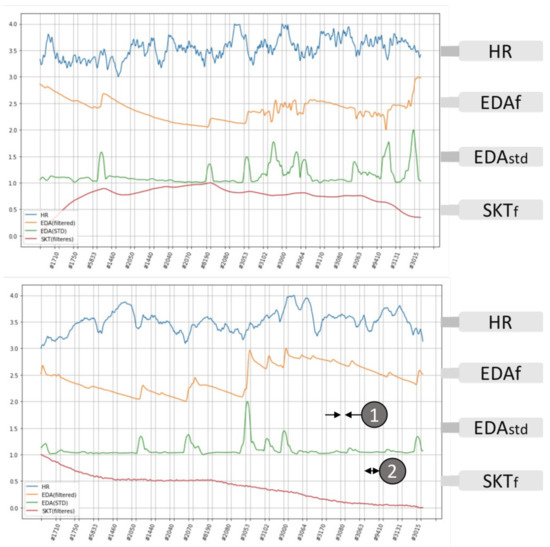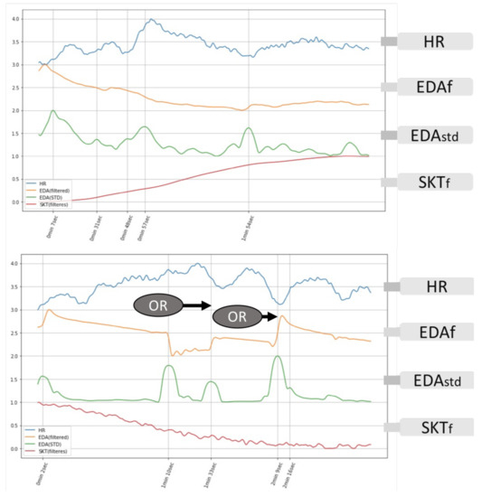 - PPG, EDA and SKT:PPG captures the blood volume pulses, which can then be used to derive features from both the time and frequency domains. EDA captures the skin conductance, and both the mean and standard deviation are extracted as features. Similar to EDA, SKT captures fingertip temperature with features derived from both the mean and standard deviation. Table 1 lists all features with the associated calculations.