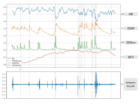 Collecting the correct moment of physiological data for feeding a well-trained statistical prediction machine learning algorithm is equally important in affective application, especially in the personalised smart services provided by IoT environments where an identification of affective moment should initiate certain operations. Orienting response (OR) has been heavily researched as an indication of attention to environmental change for animals and humans [54,55], and the OR hypothesis is further strengthened by the P3 component of the event-related potential in neuroscience research based on previous electroencephalography (EEG) measurements [56,57]. Cardiac deceleration and skin conductance changes are common indications for initiating the OR process when novel audiovisual stimuli are applied to humans, activating emotional perceptions. Recent OR research also hypothesises that the variations of cardiac deceleration can distinguish between pleasant and unpleasant emotions through audiovisual cues [58,59,60]. A synchronisation between audiovisual stimuli and the concomitant physiological variables may be able to capture this OR process, which facilitates the validation of a successful emotion elicitation for further analysis and operations. According to Kreibig’s review [29], there is no standard for the averaging interval of the physiological measurement (varying from 0.5 s–300 s and most often being 30 s and 60 s), which is the temporal quality of the elicited emotions. Therefore, the correct moment of the measurement interval from start to finish defines whether the details of the emotional responses are captured.