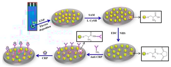 Prior to modifying the immunosensor, the SPE was pre-treated in 1 M H2SO4 solution. A potential ranging from −0.5 to +1.0 V was swept for 10 cycles at a scan rate of 50 mV s−1. Such a treatment removes the organic ink constituents/contaminants and increases the surface functionalities. Then, the AuNPs were electrodeposited by placing the mixture of 0.5 mM HAuCl4·3H2O and 0.1 M KNO3 solution onto the SPE and sweeping the potential from +0.9 to 0 V for five cycles at a rate of 50 mV s−1. To functionalize the AuNPs with anti-CRP, a self-assembled monolayer (SAM) of cysteine with a carboxylic acid (-COOH) functional head group was anchored by its AuNPs-thiol bond. Subsequently, 1 mM L-cysteine solution was poured onto the AuNPs-SPE and kept at room temperature for 4 h. After the SAM was formed, the surface of the working electrode was washed with ethanol and water before drying with a flow of nitrogen gas. In order to ensure a stable terminal activation of -COOH groups, the SAM was treated with coupling reagents containing 0.4 M EDC and 0.1 M NHS for 30 min prior to gentle rinsing cycles using PBS twice to remove the poorly attached linker molecules. Subsequently, the prepared surface was incubated with a 10 µM anti-CRP solution at an ambient temperature for 1 h. The reaction of the primary amine (-NH2) groups of the antibodies with the -COOH groups on the AuNPs resulted in a formation of stable amide bonds, as schematically shown in Figure 1. The loosely-bonded anti-CRP was removed from the electrode by rinsing with PBS before the anti-CRP-SAM-AuNPs-SPE was immersed in a 5 wt% bovine serum albumin (BSA) solution at room temperature for 1 h to block the remaining non-specific binding of antibody active sites. Finally, the ready-to-use surfaces were stored at 4 °C.