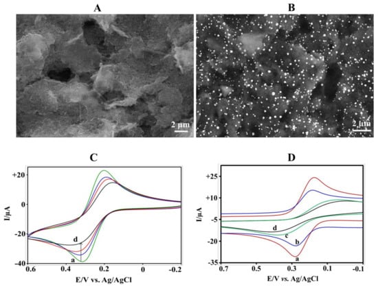 The morphological images of the bare SPE and AuNPs modified SPE are shown in Figure 2A,B. The SEM images clearly reveal a porous surface of the bare SPE. Generally, using cyclic voltammetry electrodeposition, ≈20–60 nm nanoparticles are randomly deposited over the whole conducting electrodes as observed in our study. Such a configuration is suited for the immobilization of anti-CRP without impairing its biological activity, and, moreover, facilitates electron transfer between SPE and electrochemical probe.