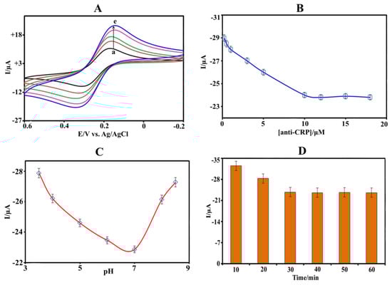 The performance of the immunosensor is mainly influenced by the antibody concentration, pH, and CRP incubation time, and, hence, these parameters have been carefully optimized. The electrochemical response of the SAM-AuNPs-SPE decreases while increasing the anti-CRP concentration from 200 nM to 10 μM and stabilizes at higher concentration, as shown in Figure 3B. The electrode was saturated with anti-CRP above 10 μM since further increasing the concentration did not influence the current response. Therefore, 10 μM anti-CRP concentration was used for the fabrication of the immunosensors. The electrochemical activity of the CRP immunosensor, incubated under the same conditions as described above, was investigated in the pH range from 3.5 to 8.5 as shown in Figure 3C. At constant oxidation peak potential (+0.3 V) of the electrochemical probe, more reduced current was observed at pH 7.0 indicating that more anti-CRP is present on the surface. Upon increasing and decreasing the pH from 7, less reduced current was observed, suggesting that the biomolecules CRP and anti-CRP are not stable at highly acidic or alkaline conditions where they lose their activity. Hence, for further measurements, pH 7.0 was selected as it appears to be the optimal pH value for CRP measurements.
