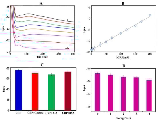 (A) Time vs. current response of the CRP immunosensor for (a) 1, (b) 2, (c) 5, (d) 7, (e) 10, (f) 15, (g) 20, and (h) 25 nM of CRP. (B) Calibration chart of the anodic oxidation current vs. CRP concentration ranging from 0.4–200 nM (y = 0.09x ‒ 23.9, r2 = 0.9985). The values for each point were averaged over three measurements. (C) Histograms representing the selectivity of the label-free CRP immunosensor toward CRP, CRP + Glucose, CRP + ascorbic acid, and CRP + BSA in PBS solution containing 0.5 mM Fe(CN)64− at a scan rate, 50 mV s−1. (D) Histograms representing the stability of the immunosensor strip under the same working conditions as described in the text.