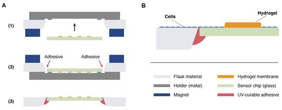 (A) Hybrid integration of the sensor chips in a milled opening in the bottom of a cell culture flask. A metallic holder was brought inside the flask and fixed with magnets from outside (1). The flask was flipped, sensor chips were positioned in a opening milled into the bottom, and UV-curable adhesive was applied (2). After curing, the magnets were removed and the holder released through the neck of the flask resulting in a positioned chip with its surface in-plane with the flask surface (3); (B) Schematic representation of the cell layer. Cells are supposed to settle on the flask and chip surface but not on the hydrogel membranes covering the sensor electrodes.