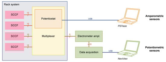 Block diagram of the SCCF instrumentation: Four flasks can be inserted into the rack system. Amperometric measurements are realized by a single-channel potentiostat integrated into a custom-made multiplexer. Potentiometric measurements can run continuously by a multichannel electrometer amplifier and data acquisition device.