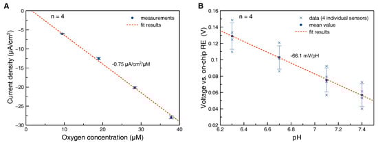 Calibration plot oxygen sensor (A): Sensors were calibrated at 37 in cell culture medium equilibrated to different oxygen content and 5% CO2 in the gas phase. Error bars represent the standard deviation of measurements from four individual electrodes fabricated in the same batch, calibration plot pH sensor (B): Sensors were calibrated after sterilization in buffer solution at 25 . Both mean value and data points from four individual electrodes were plotted. Please note that the large error bars (standard deviation) are caused by variation of the offset rather than of the sensitivity.