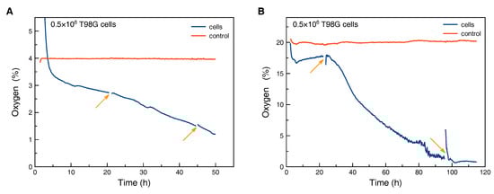 T98G cells per flask were seeded for the oxygen monitoring experiments. For the pH monitoring T-47D cells per flask were seeded. Cells for the pH measurement as well as the oxygen measurements under atmospheric oxygen conditions were cultured in a special walk-in incubator room at 37 . The flasks were equipped with tight caps encapsulating an atmosphere containing 20% O2 and 5% CO2. Cells for the oxygen measurements under hypoxic incubation condition were seeded in air before the flasks were transferred into an INVIVO2 400 hypoxic workstation (Ruskinn Technology, Bridgend, UK) with an atmosphere containing 4% O2 and 5% CO2. These SCCFs were equipped with vented filter caps allowing the atmosphere in the flask to equilibrate with that of the hypoxia workstation.