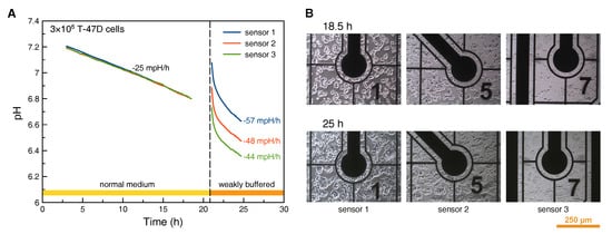 Acidification measurements were done sequentially in normal cell culture medium and weakly buffered medium (Figure 6A). After seeding of the high density cell culture, all three sensor points showed a steady, approximately linear acidification. The apparent acidification rate was mpH/h; no significant difference between the readings from the three electrodes was observed. The observed acidification is sufficiently high compared to the electrode’s inherent drift rate (less than mpH/h).