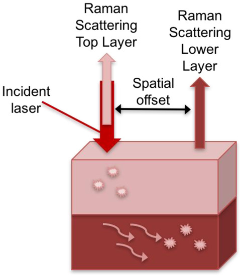 Combining SERS with spatially offset Raman spectroscopy (SORS), termed SESORS, allows for in vivo SERS measurements with increased depth penetration compared to conventional SERS. SORS takes advantage of the spatial component of light where the Raman spectra are collected at a point that is spatially offset from the incident illumination point [54]. Photons that are in deeper layers of material have to migrate laterally before scattering from the surface (Figure 1). Based on this principle, when the light is collected from a point that is spatially offset from the incident irradiation, the ability to probe subsurface layers of material is realized.