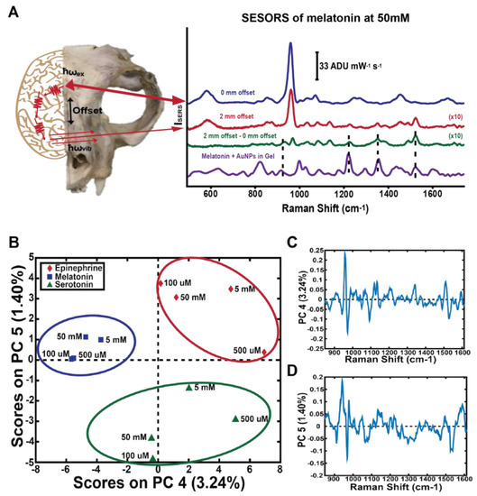 Raman scattered light was collected at a point spatially offset from the incident illumination point, allowing the signal from the neurotransmitter to be acquired through a cat skull (A). PCA was used to show that the individual neurotransmitters are clearly separated from each other in a plot of the scores of PC4 versus PC5 (B) and their corresponding loadings (C,D). Adapted with permission from Ref. [55]. Copyright 2017 American Chemical Society.