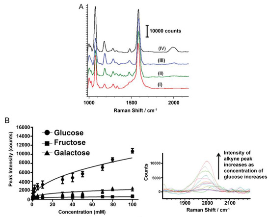 (A) Comparison of SERS spectra of phenylboronic acid-functionalized substrate with (I) no analyte, and 10 mM of (II) fructose, (III) galactose, and (IV) glucose; (B) SERS intensity of alkyne peak at 1996 cm−1 with various concentrations of glucose, galactose, and fructose. Inset is the Raman spectra, showing the alkyne peak with various concentrations of glucose. Reprinted from Ref. [70], Copyright (2014), with permission from Elsevier.
