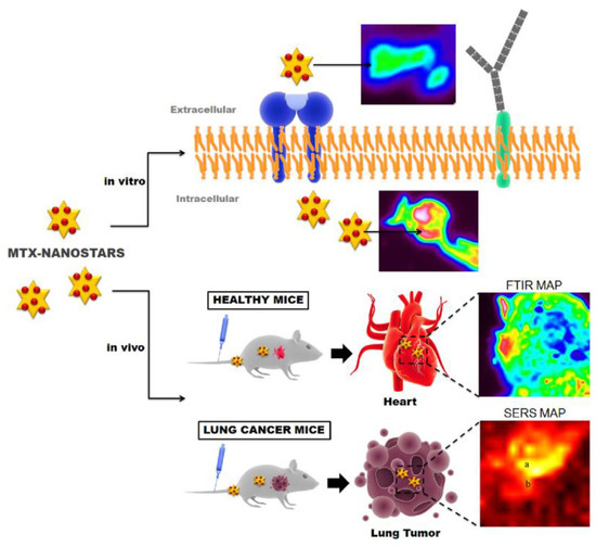 In vivo SERS detection methods have been developed to diagnose and aid with drug delivery in patients with cardiovascular diseases [84]. Healthy mice and mice with lung cancer were administered gold nanostars conjugated with Mitoxantrone (MTX-nanostars), an anticancer drug, which has also been used successfully as a non-specific anti-inflammatory therapy for patients with cardiovascular diseases or chronic heart failure, creating a SERS active probe. Delivery of the drug was tracked in real-time using SERS detection and Raman/FTIR imaging. This process is summarized in Figure 4. In the healthy mice, in vivo SERS detection found that the MTX-nanostars accumulated in the heart. In vivo SERS spectra of the tumors in the mice with lung cancer also showed characteristic SERS peaks associated with aromatic stretching of C-C (1300 cm−1) of the MTX-nanostars. While initially developed as a method for detecting drug delivery to tumors, the MTX-nanostar probes have also been applied to detection of cardiovascular diseases due to the non-specific accumulation of the MTX-nanostars in the hearts of healthy mice.