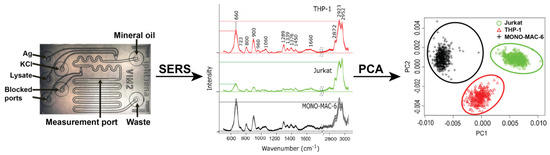 Microfluidic lab-on-chip (LOC) devices, SERS, and statistical analysis have been combined to differentiate between three different leukemia cell lines, cultivated from patients with acute lymphocytic leukemia (ALL, Jurkat cells) and acute myelocytic leukemia (THP-1 and MONO-MAC-6 cells) [114]. SERS spectra were obtained for the three cell lines, followed by PCA on the obtained spectra, resulting in well separated groupings corresponding to each cell type. This process is summarized in Figure 7. A support vector machine (SVM) model, a supervised classification and regression analysis method, was generated to classify the cell types, resulting in mean sensitivities, specificities, and accuracies of >99% for all three cell types, based on >2000 spectra total.