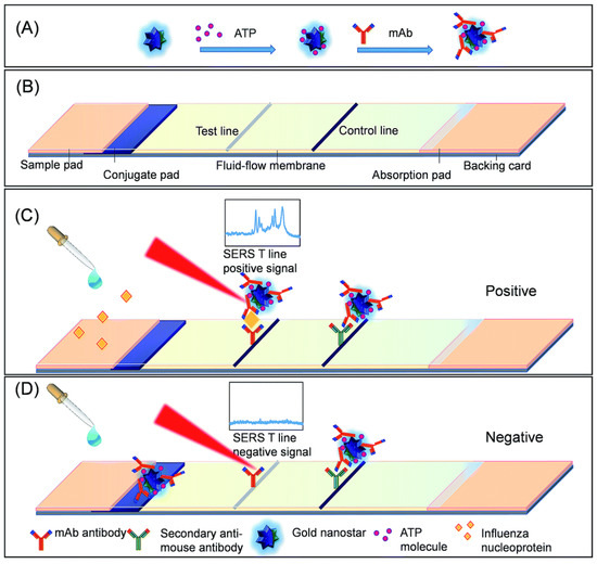 Maneeprakorn et al. [119] developed a SERS-based lateral flow immunoassay (LFIA), using influenza A nucleoprotein as a target molecule. Au nanospheres (AuNS) were synthesized following the method of Frens [120], followed by the growth of multibranched Au nanostars, which were tagged with 4-ATP (AuNS-ATP)). Antibodies were subsequently conjugated to the AuNS-ATP. Samples containing the target analyte were applied to LFIA strips, where nucleoprotein-NP complexes migrated across the strips to be captured by the antibody conjugated to the NPs and SERS spectra were taken at the site of accumulation on the strip. A summary of this assay is shown in Figure 8. The LOD was determined to be 6.7 ng mL−1. Samples of allantoic fluid including influenza A (H1N1) were also tested and supported the validity of the method to test for the virus in a matrix.