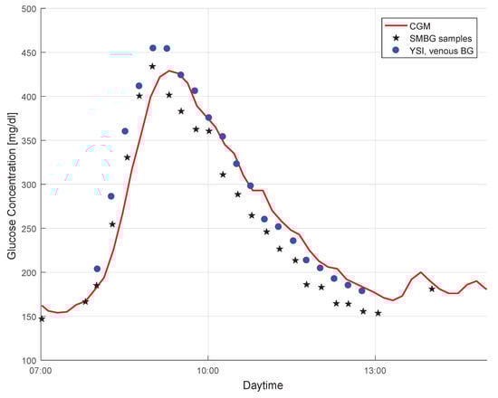 The effect of the time lag between BG and IG is evident in Figure 1. The plot shows a data segment (red curve) in a CGM profile, and also the BG point measurements collected during the same time period. Both capillary BG measurements by means of SMBG (stars) as well as venous BG measurements by means of YSI (dots) are shown. The CGM signal lagged behind the SMBG measurements, but followed the BG profile well. It must be mentioned that the time delay between both signals was also caused by additional factors, such as time required for the measurement and filters used (see [49,50]).