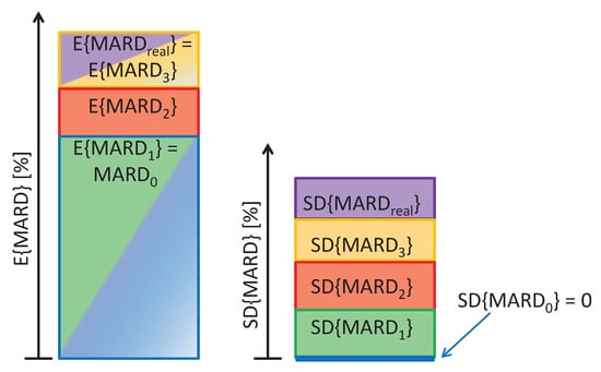 Under real-life conditions, the criteria necessary to obtain are impossible to meet. Deviations from those ideal conditions will result in MARD values that are significantly different from . Whereas some of the factors influencing MARD only lead to a stochastic effect which results in an uncertainty in MARD (limited number of paired reference measurements, distribution of paired measurement points), others cause a significant increase in MARD (error in the reference measurement, physiological CGM time delays). In the following formula, it is shown how each of these factors leads to an increase in the uncertainty of MARD (expressed as the standard deviation of MARD, ) and possibly also an increase in the expected value of MARD ():