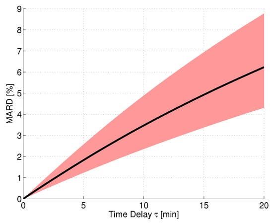 In order to simulate a CGM system performance assessment under ideal conditions, an in silico study was performed using the continuous BG traces calculated with the approach from [44] based on the clinical data from trial [15] (see Section 2). For this evaluation, it was assumed that the sensor measured IG without any consideration of measurement noise, bad CGM calibrations, or other effects. Furthermore, the reference measurements were assumed to correspond to the BG concentration without any measurement errors. Based on the continuous BG traces, the corresponding IG traces were calculated using the two-compartment diffusion model, Equation (6), with different values of . The MARD was then calculated using all points along the glucose trajectories, thus having a very high number of paired measurements. The resulting MARD values as a function of the time delay value can be seen in Figure 3. The black line shows the average MARD of all 12 patients of the dataset, whereas the red-colored area displays the variation of MARD values between patients (minimum and maximum MARD). The physiological time delay alone (roughly 11 min [46]) resulted in MARD values on the order of 4%. The MARD values were different for different patients, because of their difference in glycemic variability: A higher level of glycemic variability (i.e., also higher glucose rate-of-change, ROC) results in larger differences between BG and IG (see also [59] for this effect).