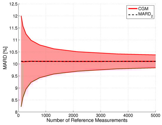 Since the measurement errors in the CGM and the reference measurements are stochastic in nature, MARD itself becomes a stochastic quantity. As can be expected, since MARD is an average of stochastic quantities, the amplitude of the stochastic portion of MARD will decrease with an increasing number of paired measurements. For a number of measurement points tending towards infinity, MARD is expected to converge towards a fixed value. On the other hand, the fewer paired measurements that are taken, the bigger will be the resulting uncertainty of MARD (see also Section 3.2.1).