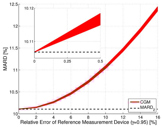 Figure 5 shows the results of the Monte Carlo simulation for the illustrative CGM system CGM2. Notice that an increase of the error of the reference measurements did slightly increase the uncertainty (seen by the thickness of the red line), but primarily increased the value of MARD. This increase in MARD was proportional to , with a proportionality constant that depends on the value of , with larger values of leading to a smaller proportionality constant. That is, the error in the reference measurements is more important for CGM sensors with a high measurement performance. Roughly speaking, the MARD computed from a clinical study is the sum of the MARD of the CGM system and of the MARD of the reference system. With the continuous improvement of CGM systems, a MARD value computed from the data of a clinical study in which SMBG devices were used as reference may turn out to be more of an evaluation of the accuracy of the SMBG device rather than of the CGM system. It should furthermore be noticed that the results shown in Figure 5 were obtained using the entire vector of paired points. For a lower number of reference points, this width would be larger.